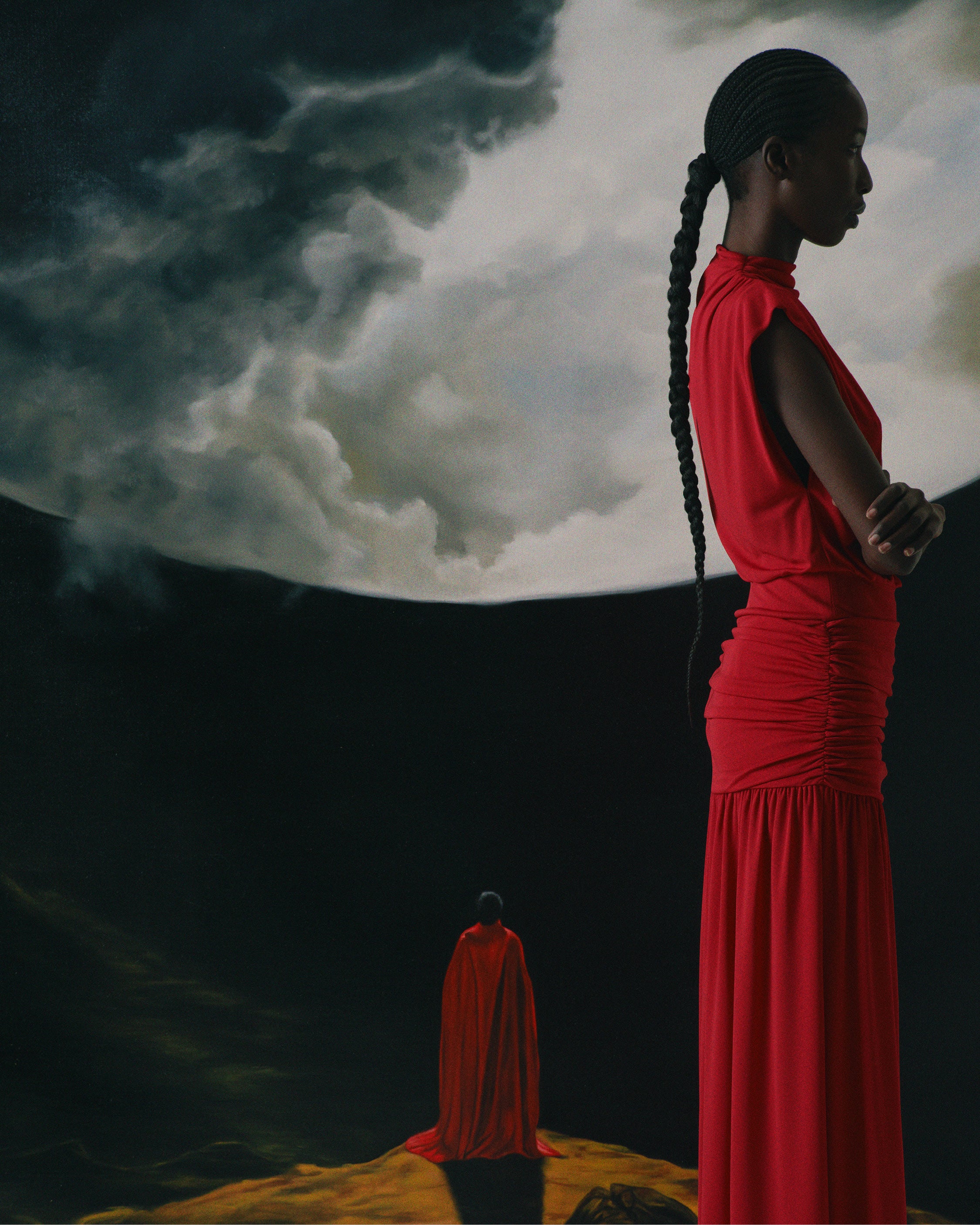 Born from a dialogue with artist Gustavo Nazareno, the collection explores the connection between inner and outer worlds, translating symbolism, chiaroscuro, and spiritual tension into sculptural silhouettes, enveloping drapes, and precious materials. From iconic outerwear to refined knitwear and expressive, theatrical pieces, each creation reflects a balance between strength and contemplation.