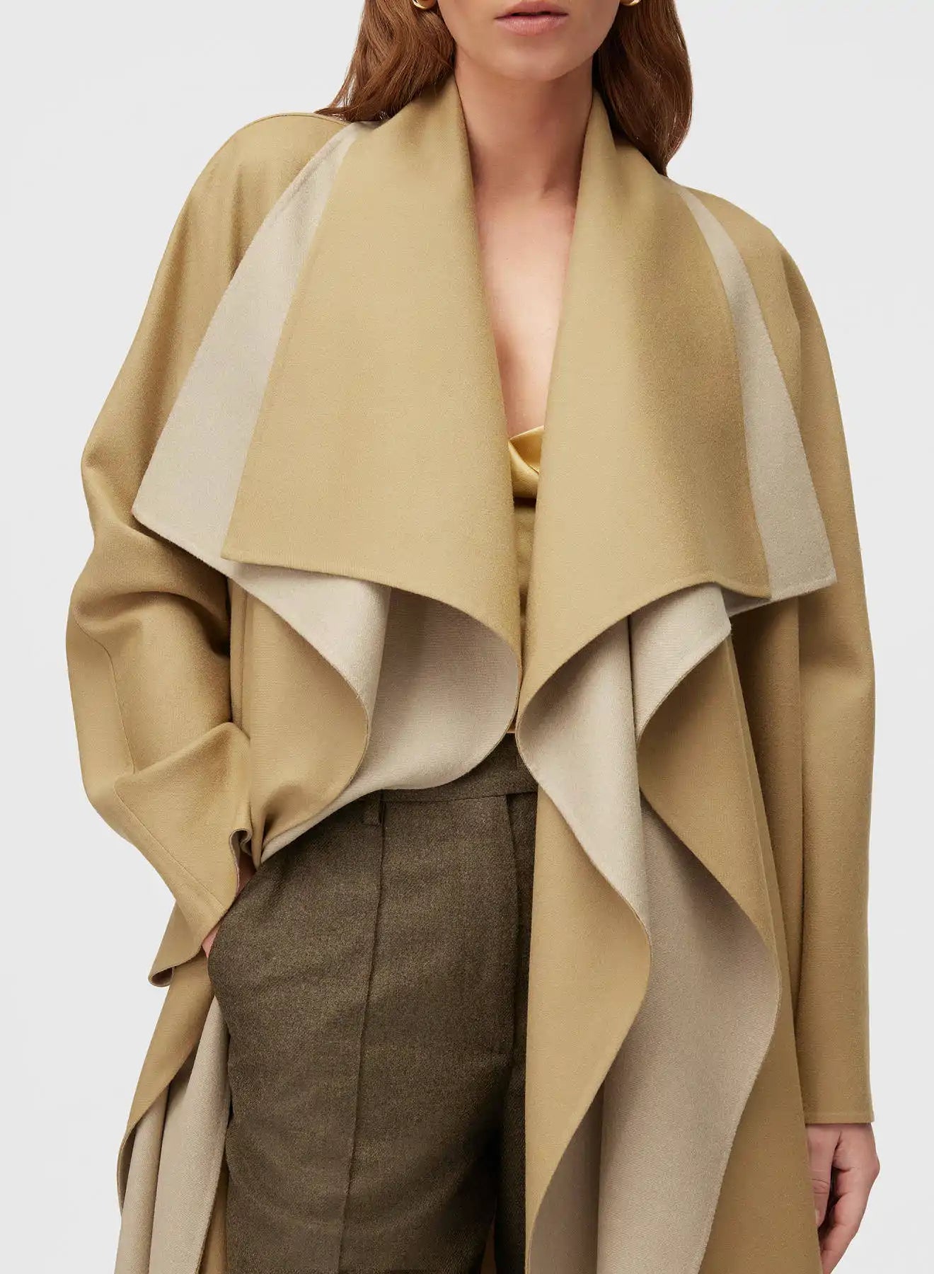 A timeless expression of sophistication and sartorial excellence, this impeccable statement coat is hand-crafted in unlined pure wool according to the Double technique. The cocooning silhouette is elevated by invisible stitching, two front panels and internal pockets highlighting the bicolor effect. Lightweight yet enveloping, it's the embodiment of comfort and a relaxed attitude.