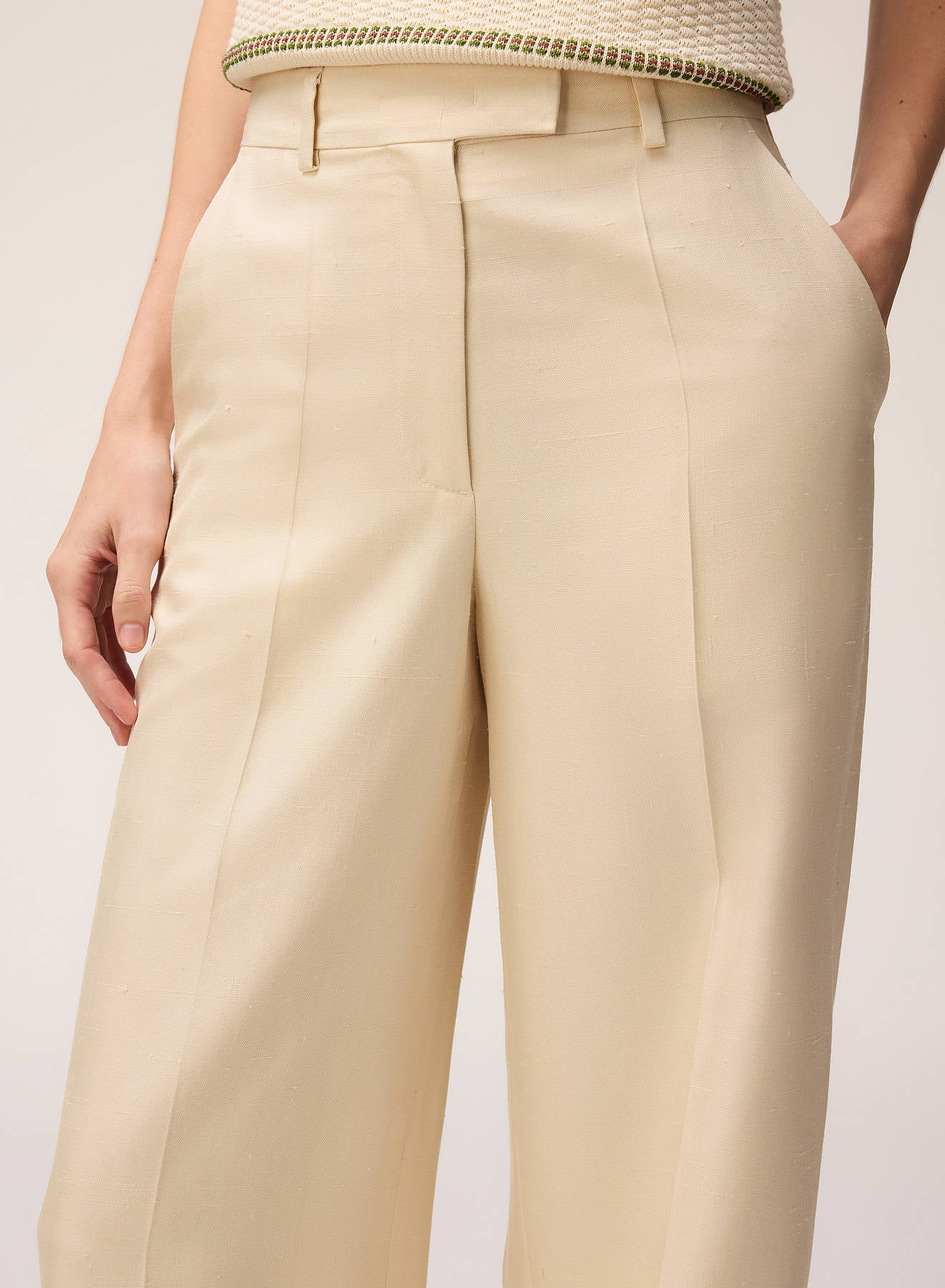 Crafted from textured shantung silk, these tailored pants feature a high-rise, wide-leg silhouette with a pre-shaped waistband for a flattering fit. The two front pleats and side pockets enhance the modern appeal of this design, a blend of sartorial codes and contemporary sophistication.