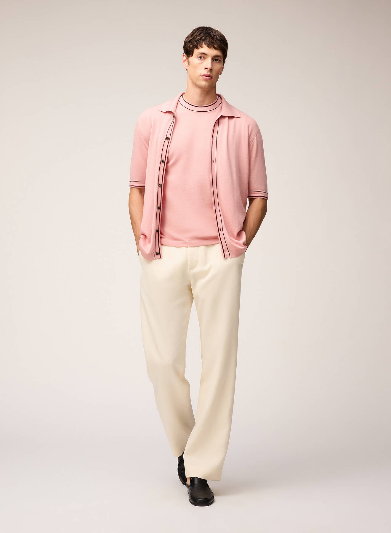 Crafted from a soft, jersey-like blend of cotton, cashmere, and silk, this T-shirt balances comfort with refined elegance. Contrasting stripes accent the collar and cuffs, adding a modern, graphic touch. The piece was designed for both men and women coming in a regular fit and oversize fit, respectively.
