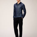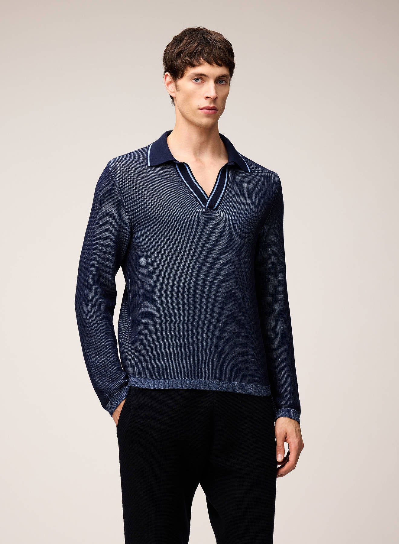 Crafted from extra-fine cotton using the vanisé technique - a dual-thread construction with contrasting yarns on the front and back - this long-sleeve polo shirt showcases a sophisticated two-tone effect. The buttonless design is finished with vanisé ribbed hem and cuffs, while the collar and placket are subtly accented with contrasting stripes, lending the piece a refined, elegant touch.