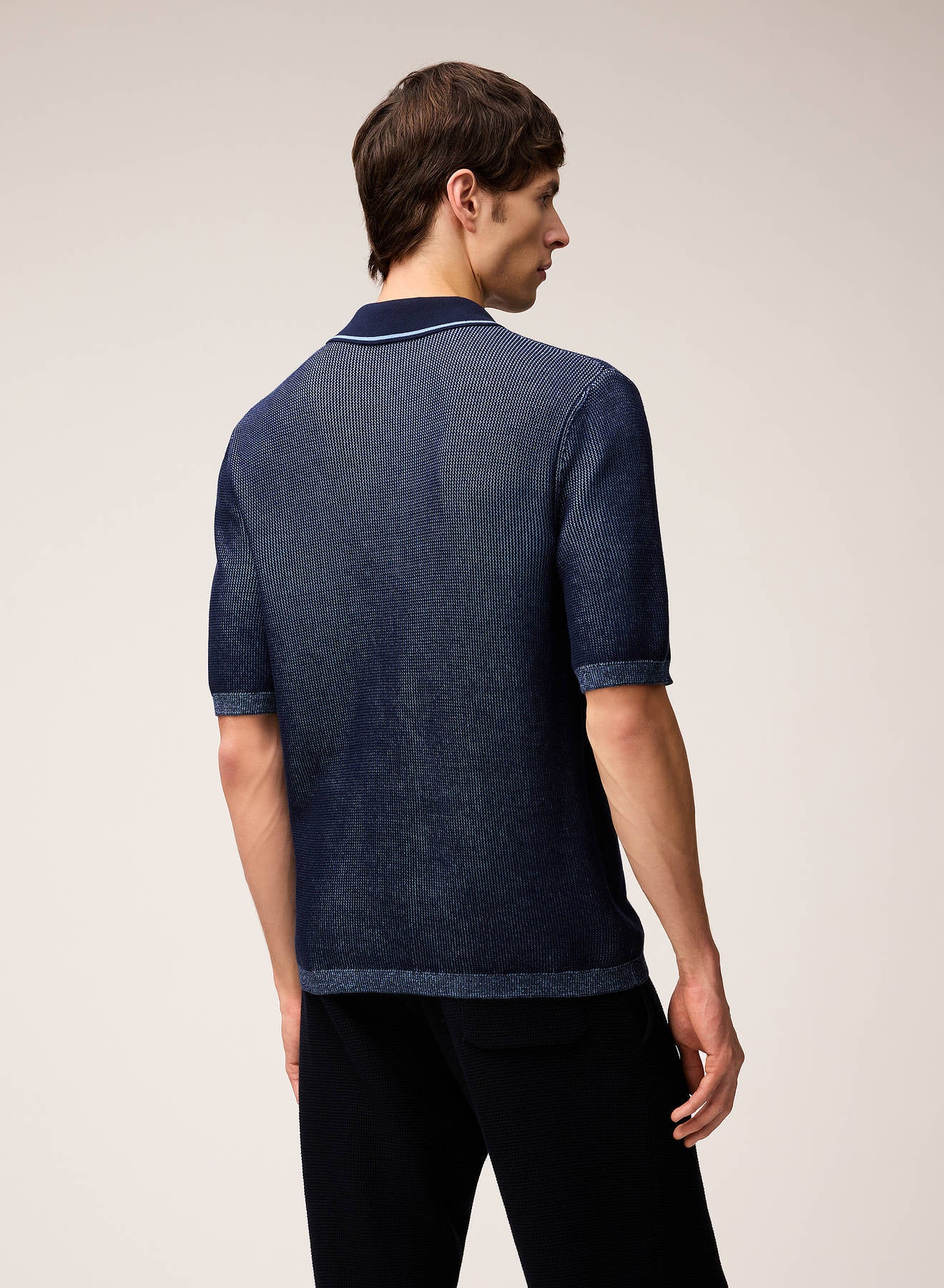 Crafted from extra-fine cotton using the vanisé technique - a dual-thread construction with contrasting yarns on the front and back - this short-sleeve shirt showcases a sophisticated two-tone effect. The design is finished with vanisé ribbed hem and cuffs and horn buttons, while the collar and placket are subtly accented with contrasting stripes, lending the piece a refined, elegant touch.
