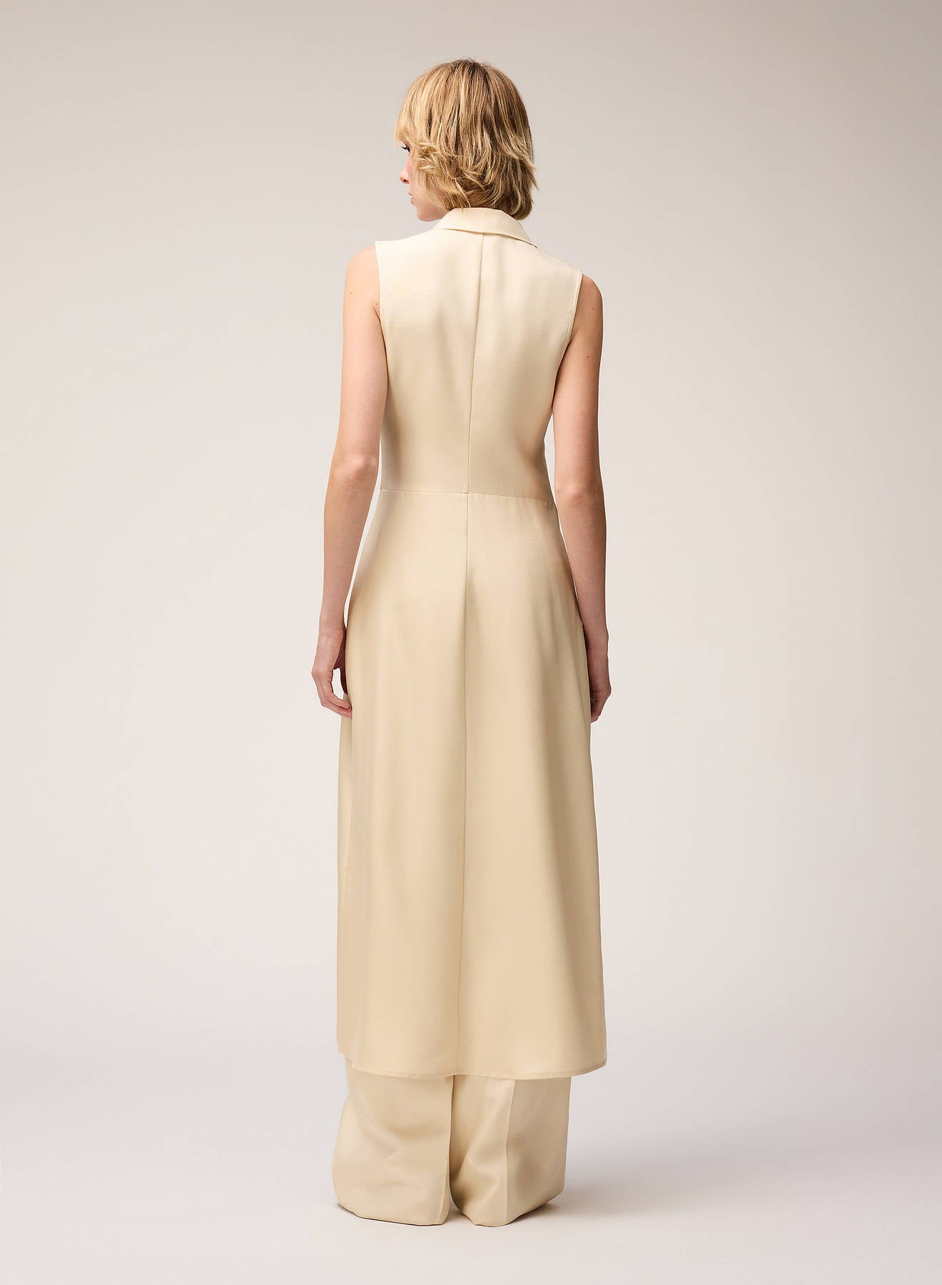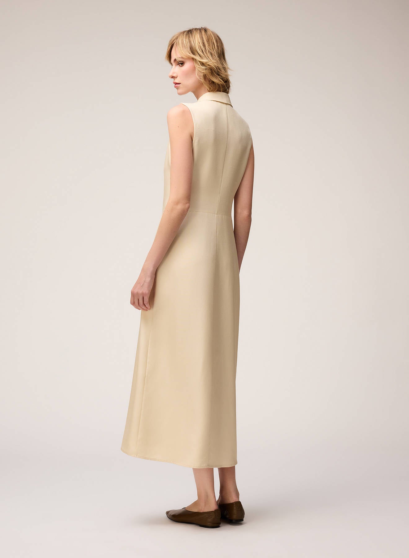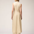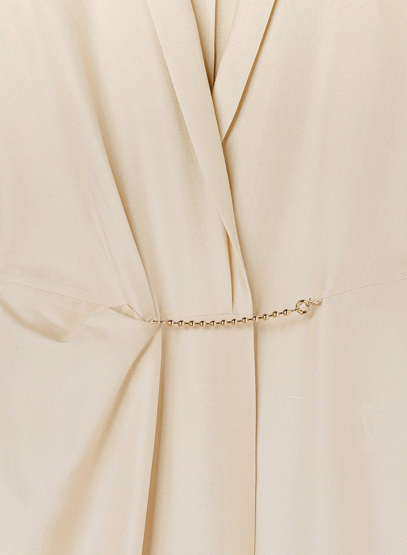 The iconic trench dress returns in a new iteration for Retori's Chapter 03 collection. Celebrated for its modern, sophisticated, and versatile silhouette and the hybrid design inspired by the sartorial construction of trench coats, this midi-length version is crafted from pure silk with a textural finish. Intended to be worn as an elegant dress or layered over pants for a coordinated, contemporary ensemble, the dress features a metal chain closure inspired by the work of artist Manuela Navas, whose personal story of renewal and evolution informed this Chapter.