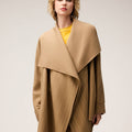 This shawl-collared, gracefully draped jacket in lightweight pure wool is hand-crafted according to the Double technique, with its signature invisible stitching and unlined silhouette exuding sartorial mastery. The outerwear piece combines two layers of airy wool creating a subtle bicolor interplay between the striped and solid sides and lending the garment fluidity and movement at every step. it features two side patch pockets.