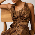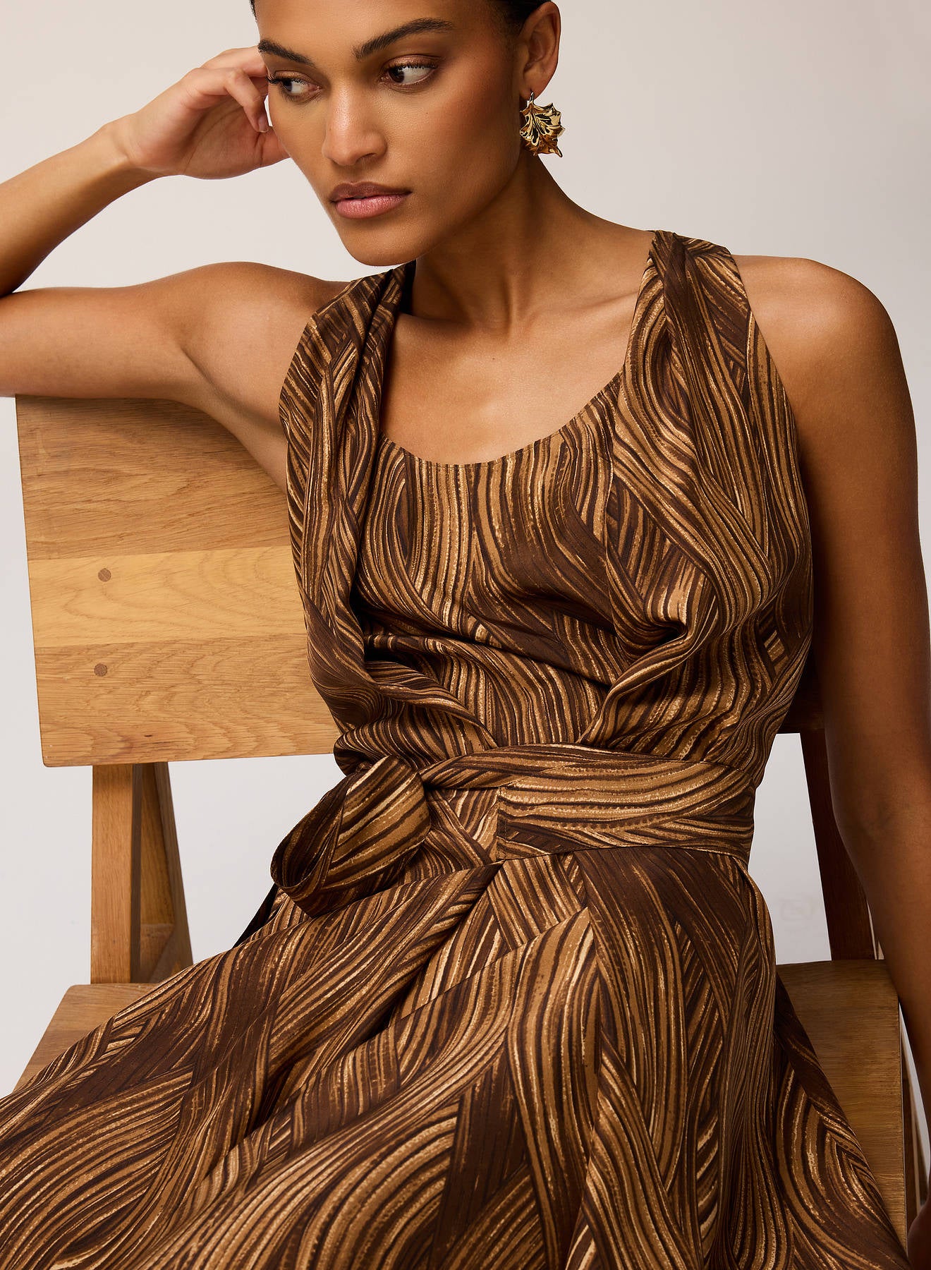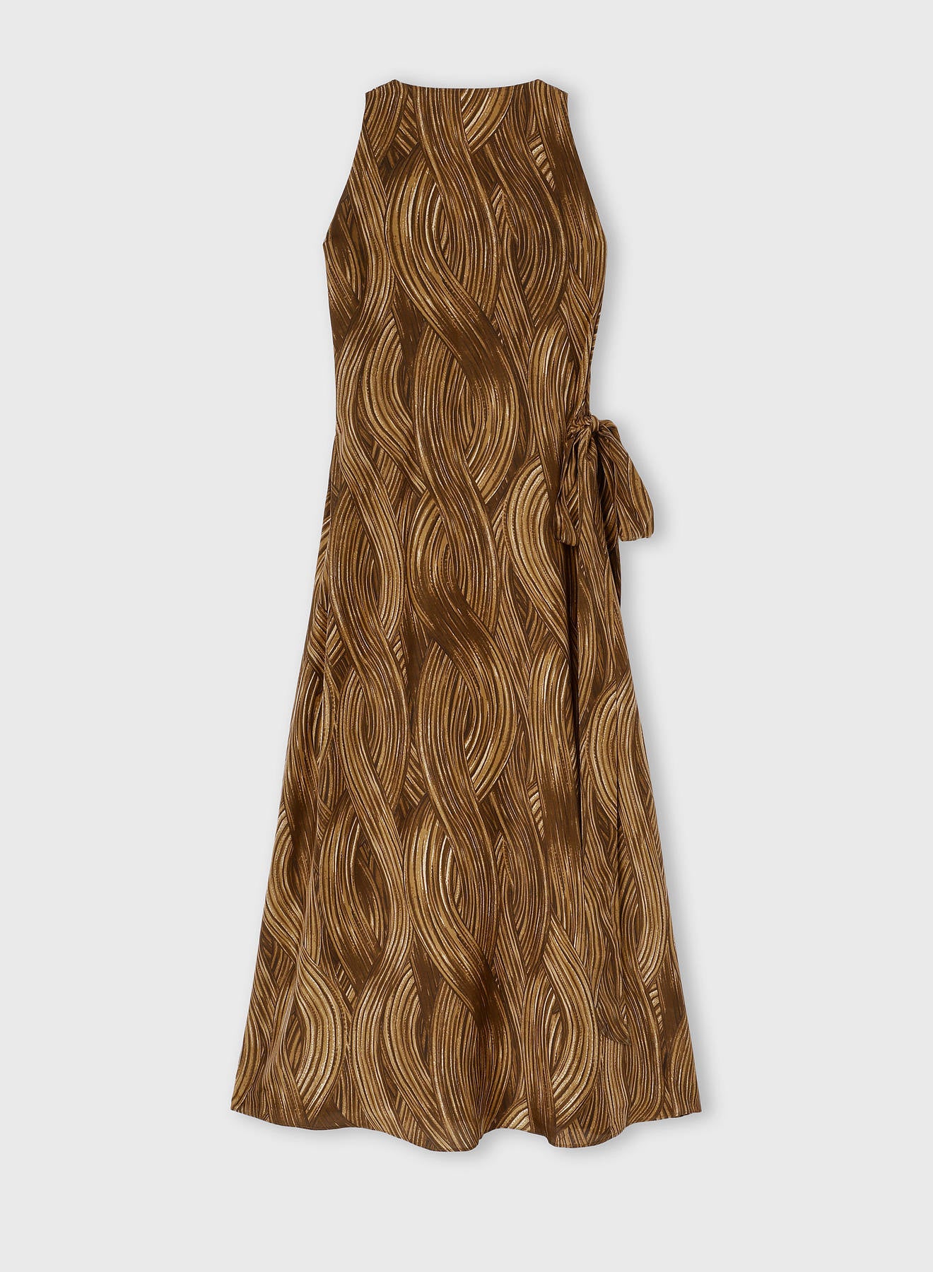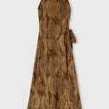 This pure silk dress boasts an allover grass-thread motif inspired by a painting by Manuela Navas, the artist whose personal story of renewal and evolution informed Retori's Chapter 03 collection. The side-fastening fabric belt gently defines the waist creating a refined interplay of volumes and soft, elegant draping. The relaxed, rounded neckline underscores the design’s understated sophistication and fluidity of movement.