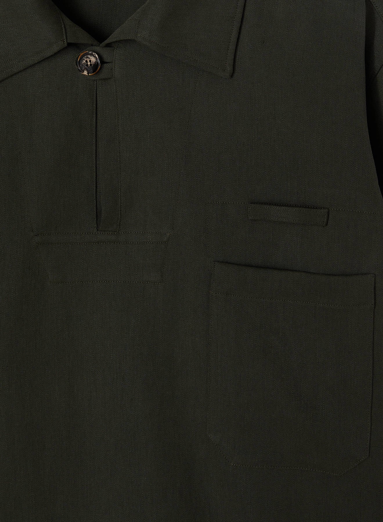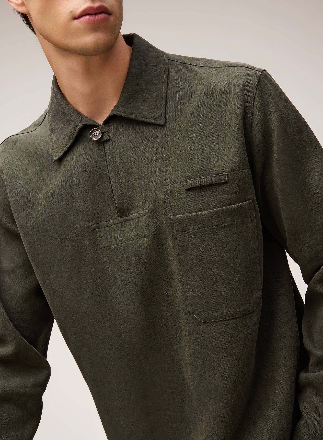 Must-have estremamente versatile, questa polo può essere indossata da sola oppure sovrapposta alla giacca sahariana abbinata per un look moderno e coordinato. Realizzata in uno speciale filato di lino ultra-soft mano pesca, che regala una sensazione ricca e piacevole a contatto con la pelle, è completata da una tasca applicata sul davanti, bottoni in corno e un funzionale passante in tessuto posizionato sopra la tasca, ideale per portare occhiali, penne o piccoli oggetti. Il colletto può essere chiuso sia tramite bottoni che con il passante in tessuto, offrendo un indosso elegante e disinvolto.