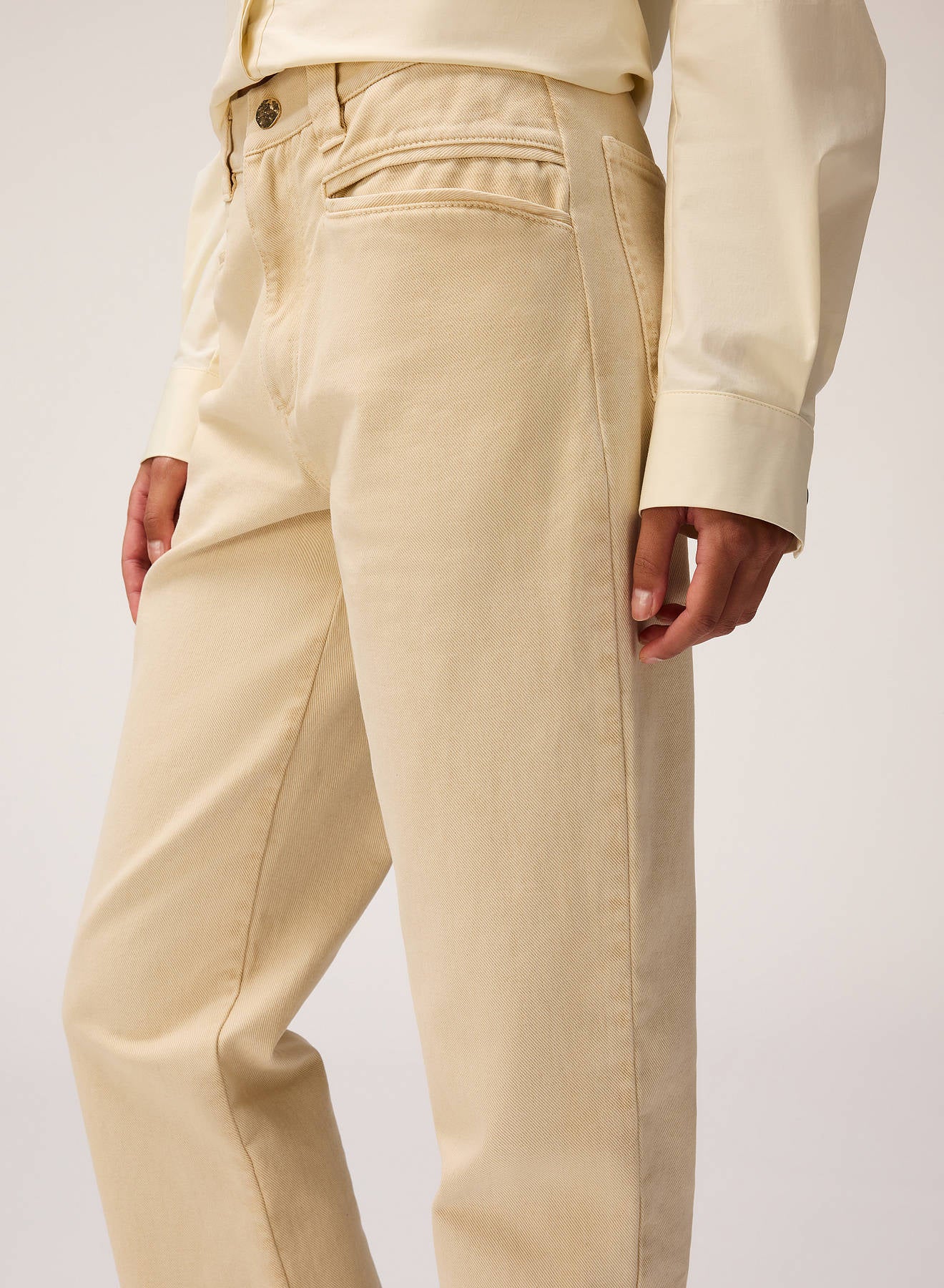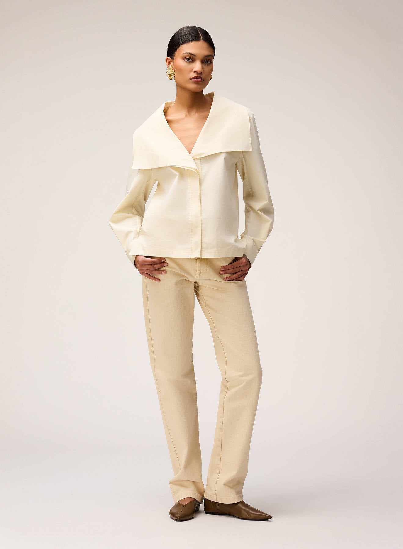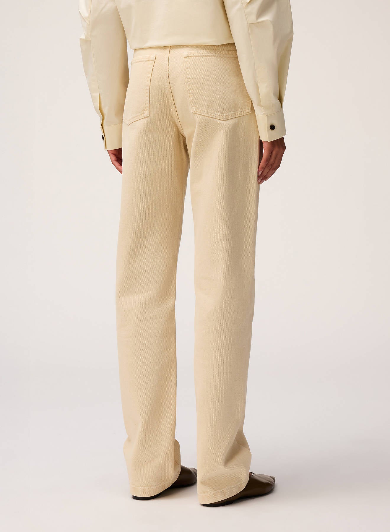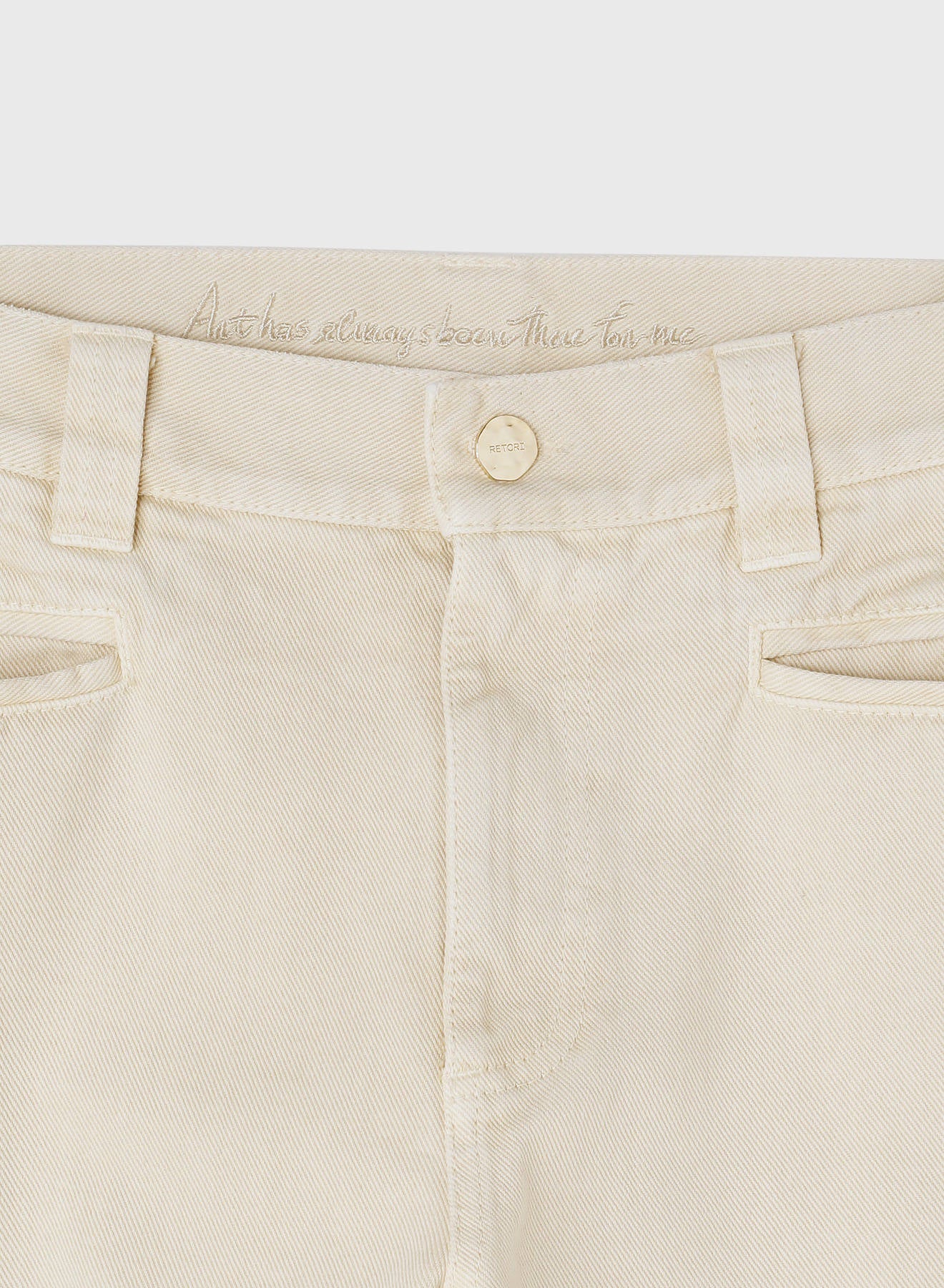 Realizzati in puro cotone, questi pantaloni denim dalla vestibilità regular incarnano eleganza versatile e trans-seasonal dall'attitudine contemporanea e disinvolta. In linea con l'ispirazione artistica della collezione, l'interno della cintura è ricamato con la frase “Art has always been there for me” di Manuela Navas, artista la cui storia personale di rinnovamento ed evoluzione ha ispirato la collezione Chapter 03 di Retori. Il modello è completato da due tasche frontali orizzontali, pensate per una maggiore funzionalità, e da un bottone martellato placcato oro inciso con il logo Retori, che aggiunge un tocco di sofisticata eleganza.