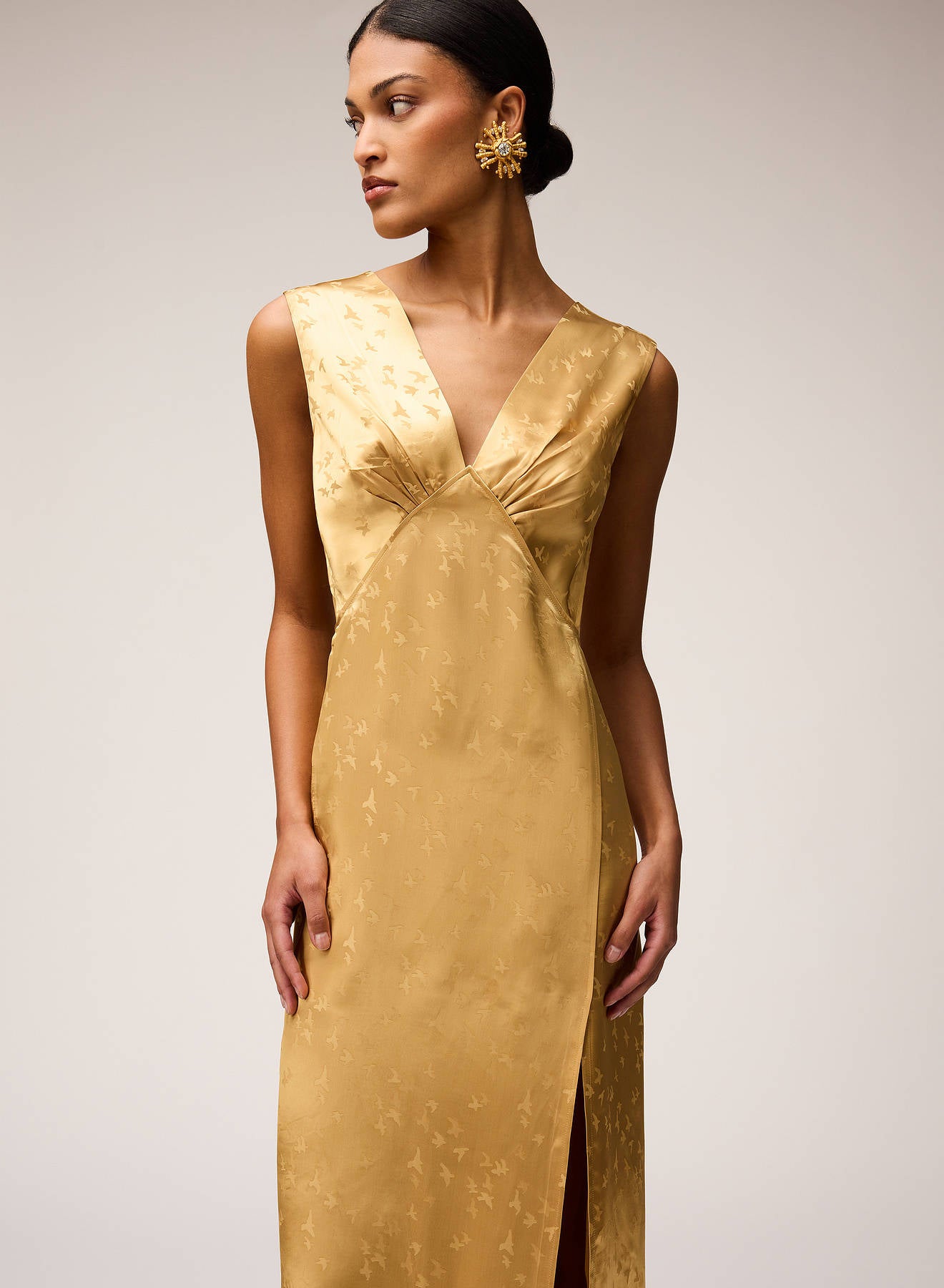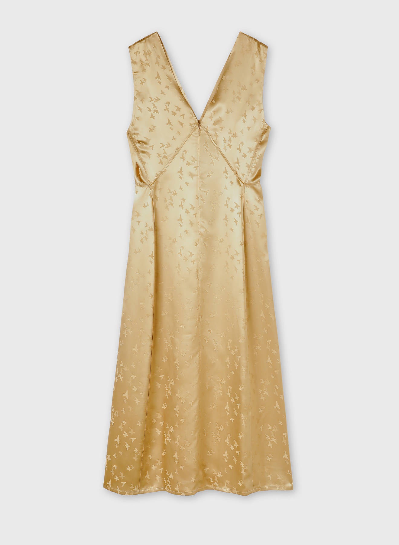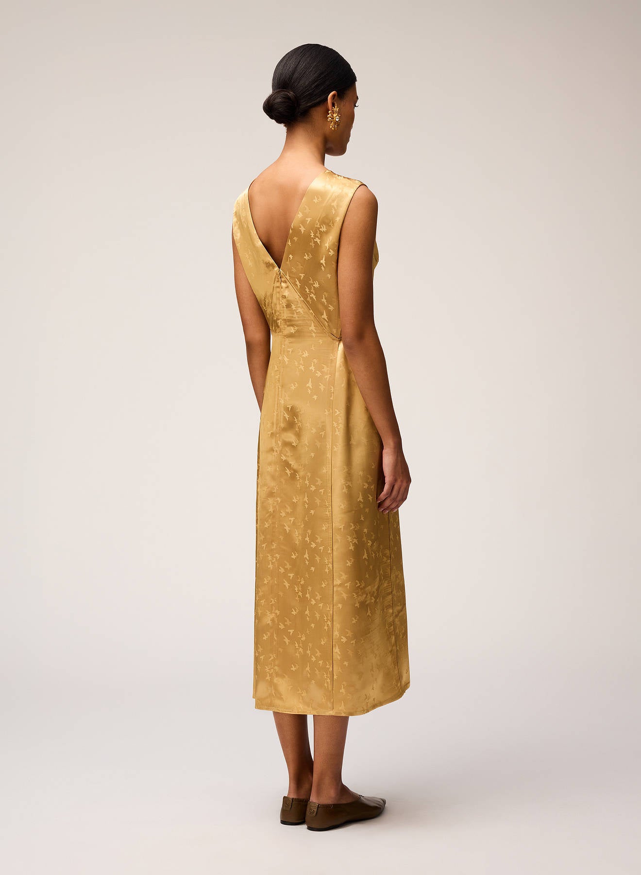 Crafted from luminous jacquard viscose, this dress is adorned with a delicate bird motif inspired by the artworks of Manuela Navas, whose personal story of renewal and evolution informed Retori's Chapter 03 collection. Blending sophistication, fluidity, and understated artistry, the dress features a graceful V-shaped neckline - mirrored on the back side - embellished with meticulously pressed pleats, which add a languid touch to the midi-length style featuring a side slit for extra movement. The concealed center-back zipper ensures a seamless, elegant finish.