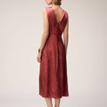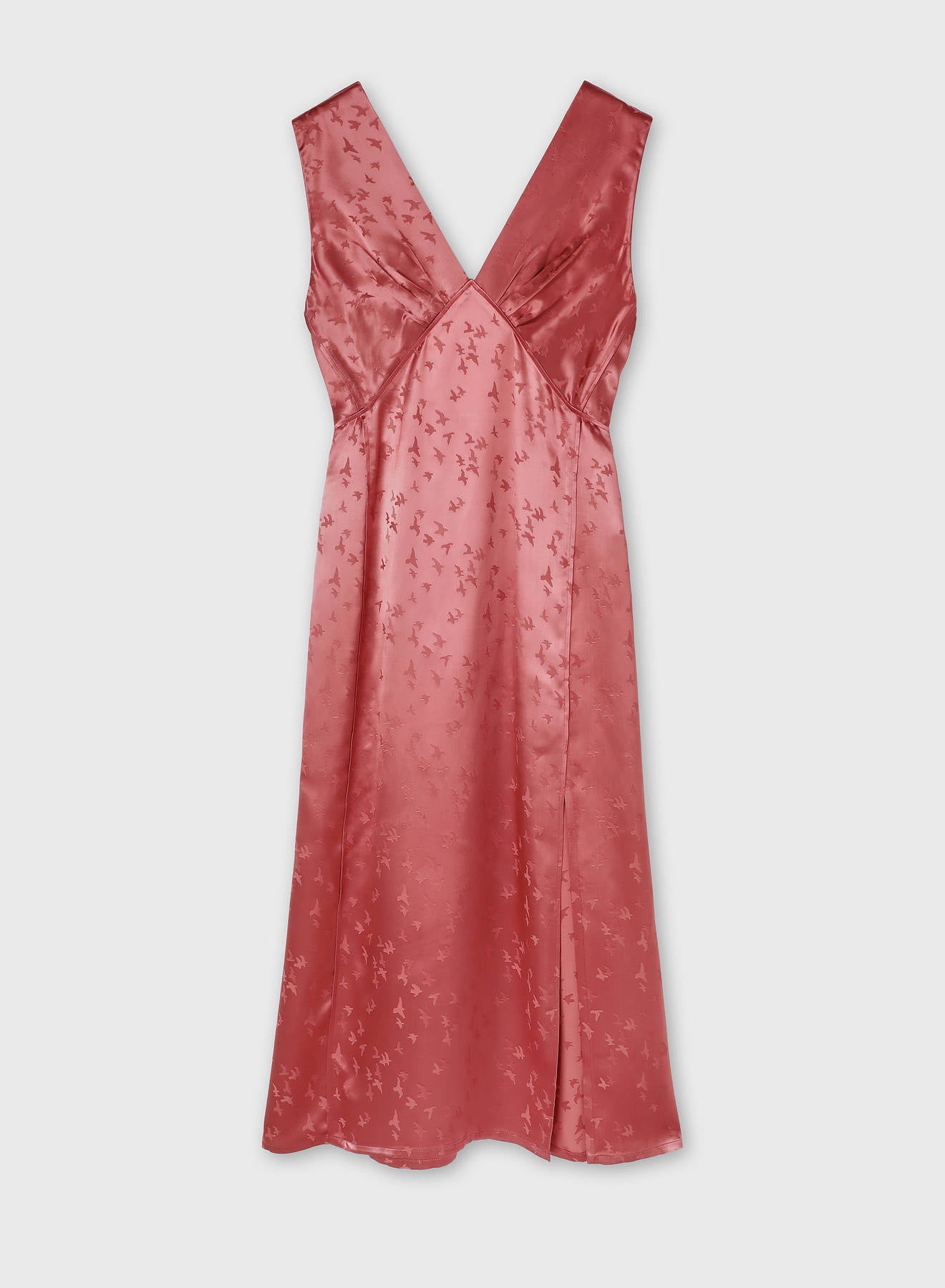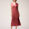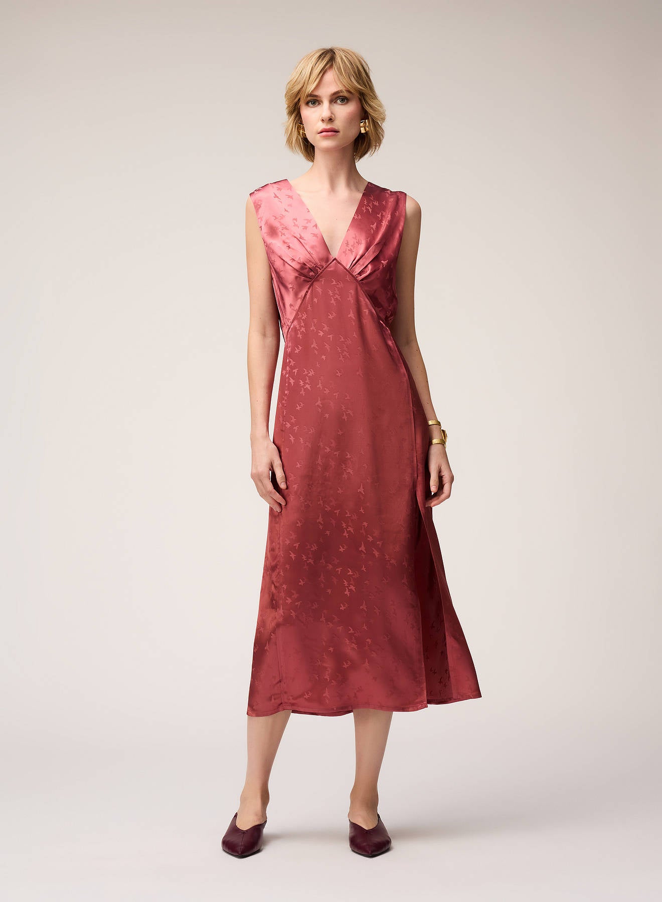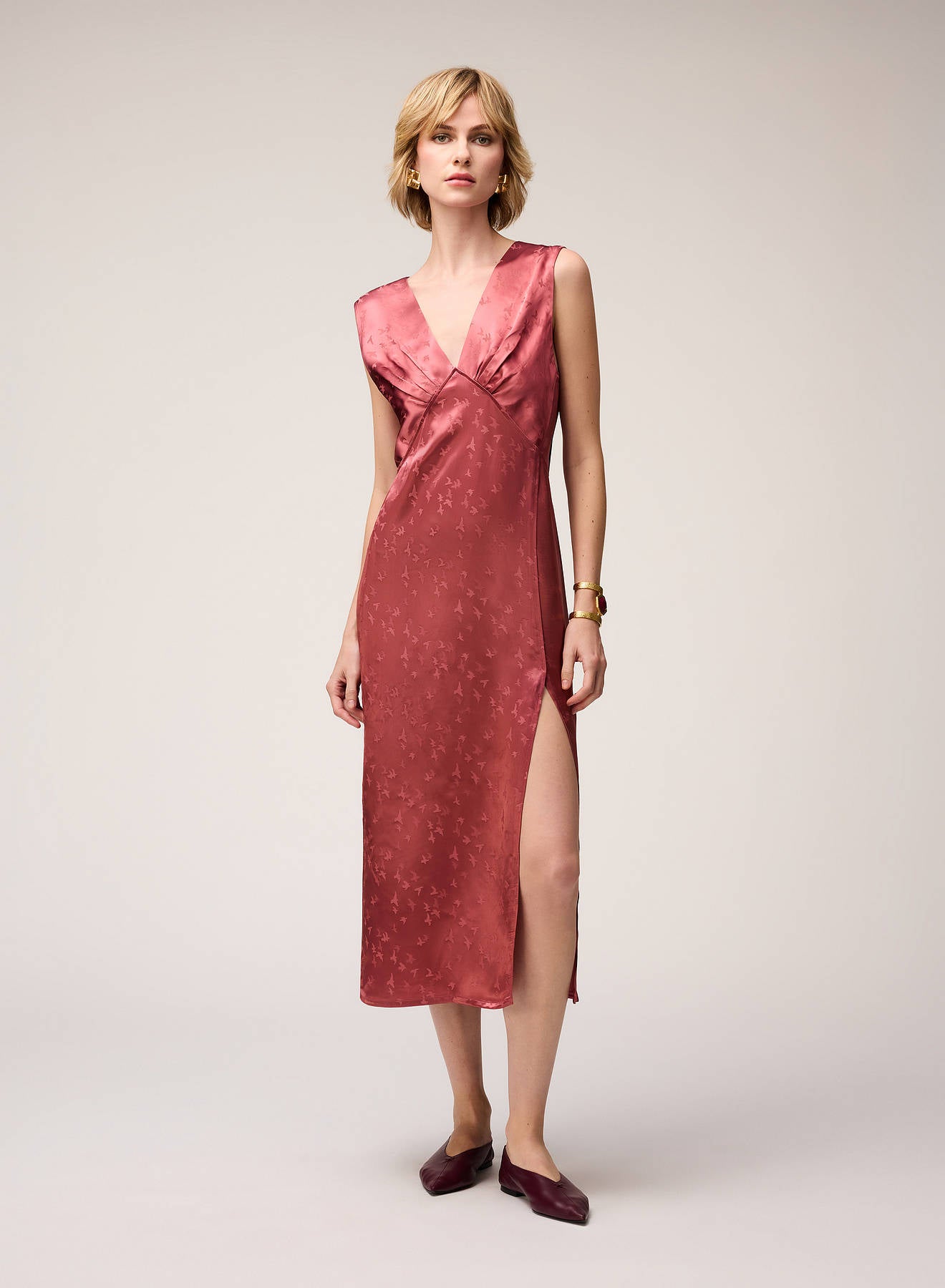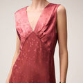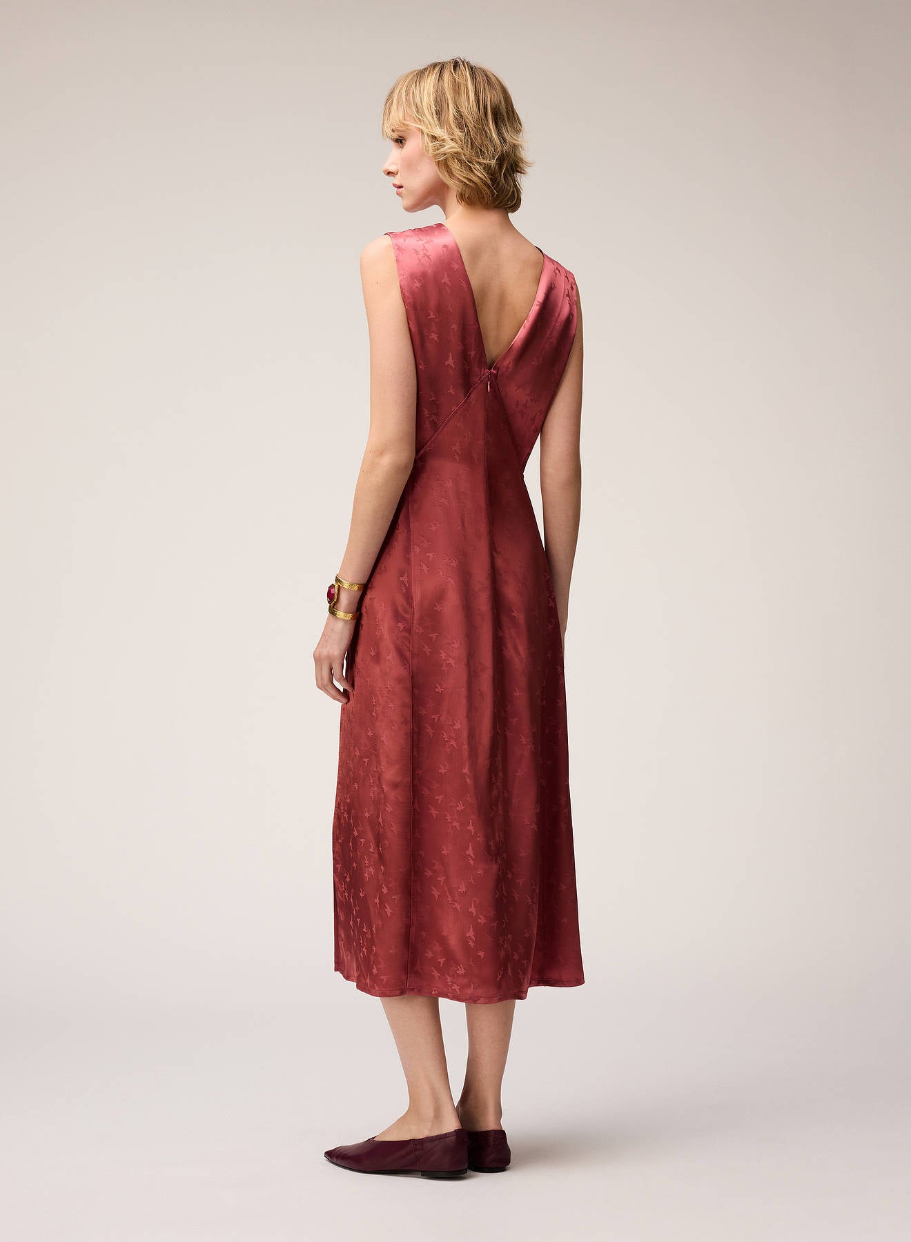 Crafted from luminous jacquard viscose, this dress is adorned with a delicate bird motif inspired by the artworks of Manuela Navas, whose personal story of renewal and evolution informed Retori's Chapter 03 collection. Blending sophistication, fluidity, and understated artistry, the dress features a graceful V-shaped neckline - mirrored on the back side - embellished with meticulously pressed pleats, which add a languid touch to the midi-length style featuring a side slit for extra movement. The concealed center-back zipper ensures a seamless, elegant finish.