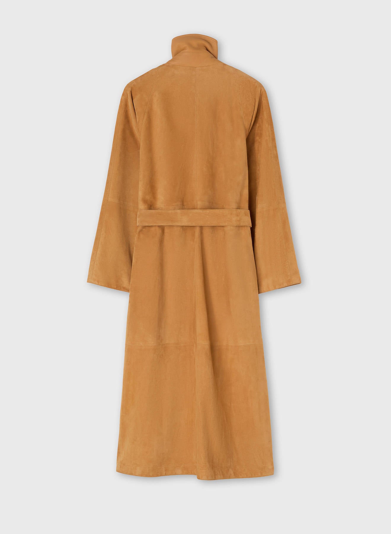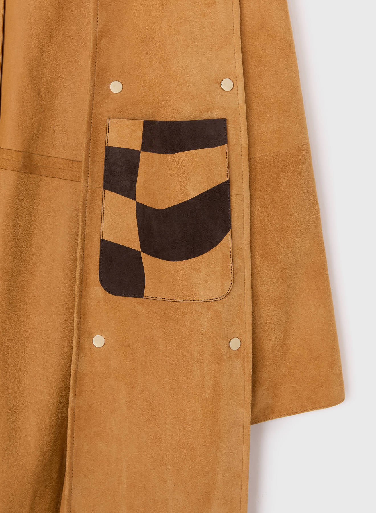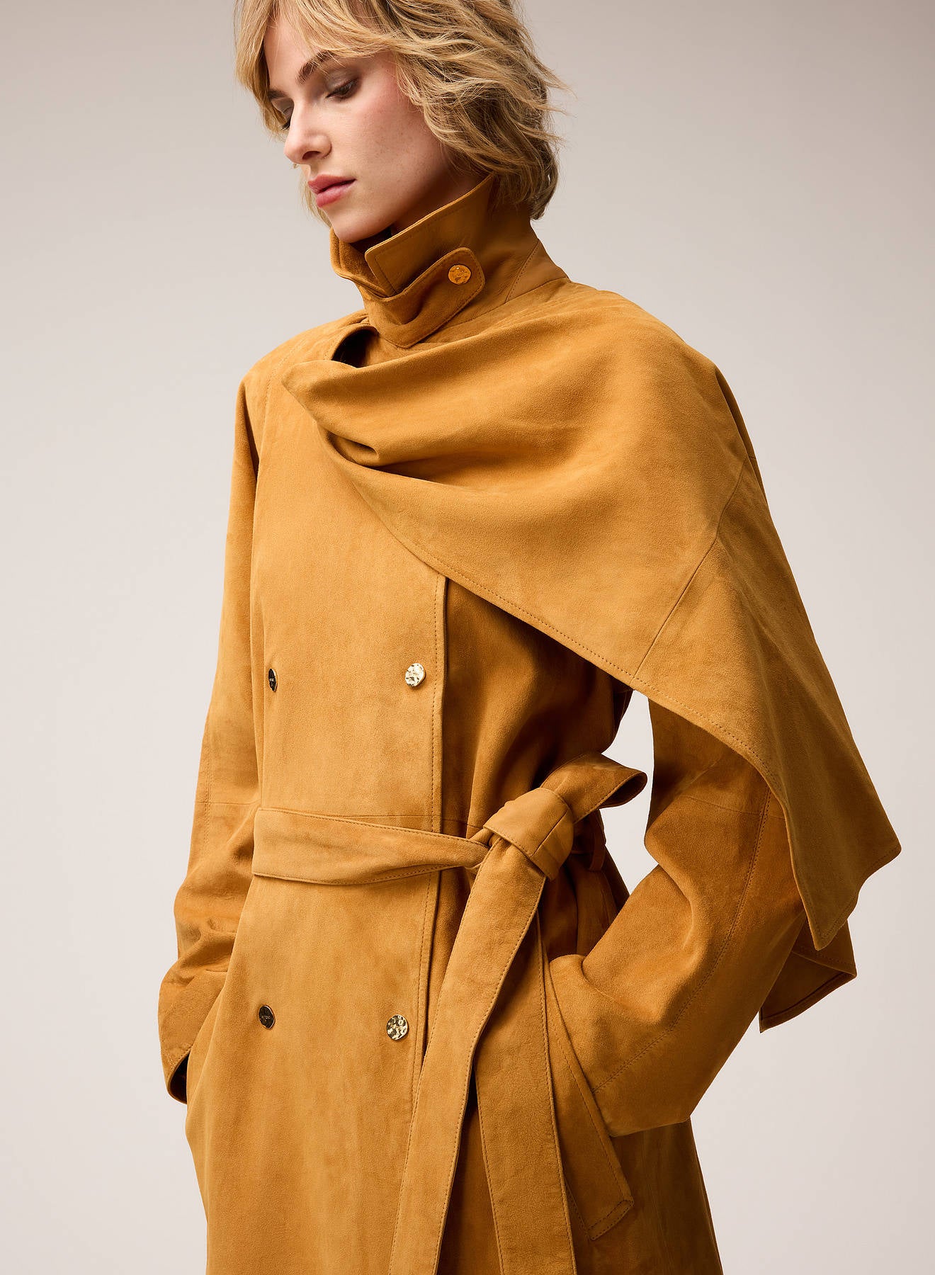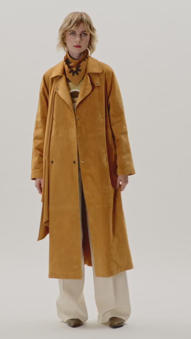 This trench coat designed with a non-detachable integrated scarf and a structured collar latch is defined by a sharp, tailored silhouette. Crafted from exquisite lamb suede with a nappa reverse side that provide a sumptuous texture further elevating the garment's refinement, it is designed for durability thanks to the unique treatment protecting the outer and inner layers. A matching suede belt cinches the waist, while the signature pocket features an intricate geometric inlay inspired by Manuela Navas, the artist whose personal story of renewal and evolution informed Retori's Chapter 03 collection. Finished with gold-plated, logo-engraved hammered snap buttons, this piece is a statement of elevated craftsmanship.