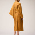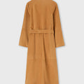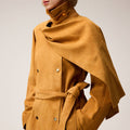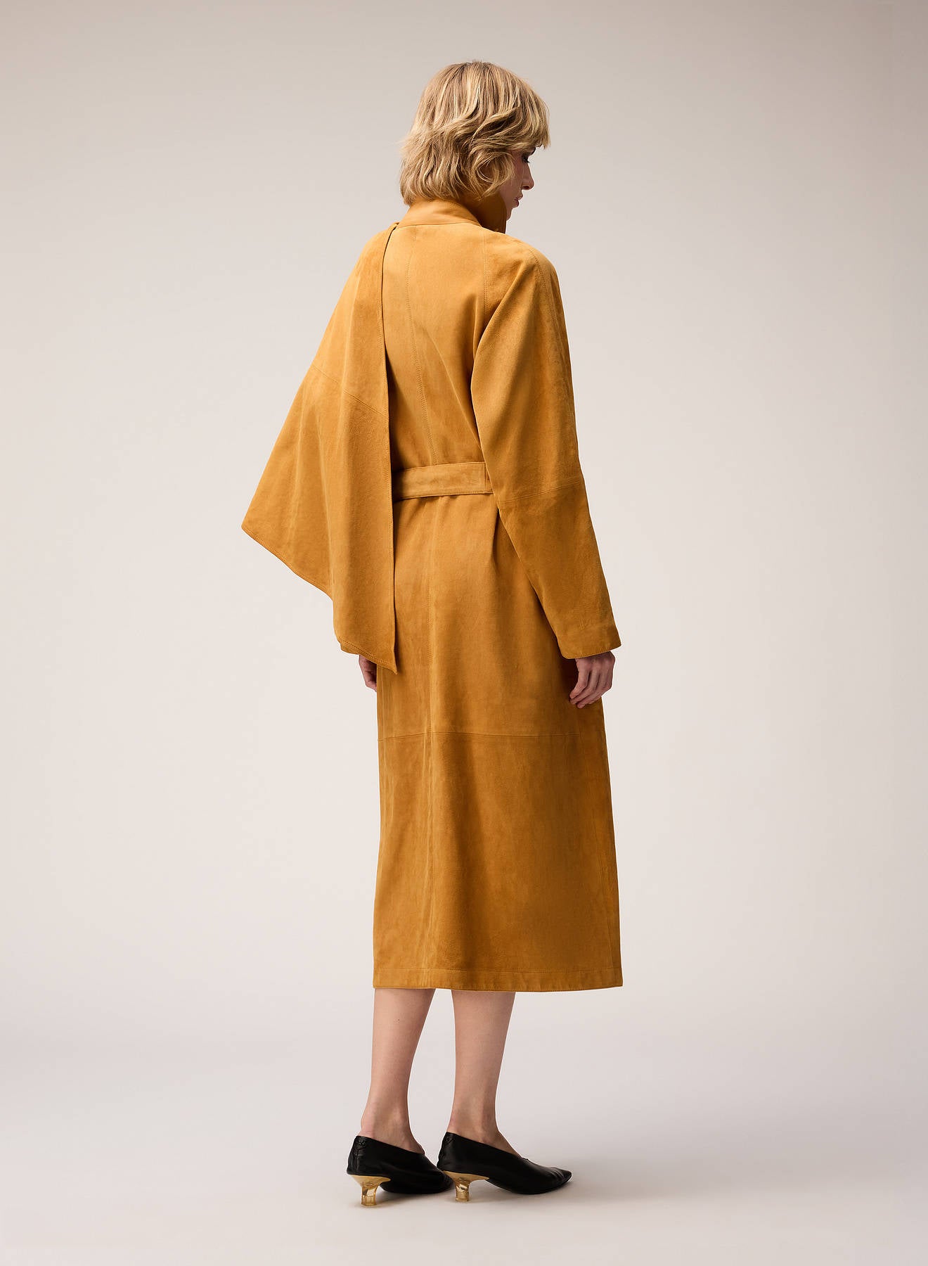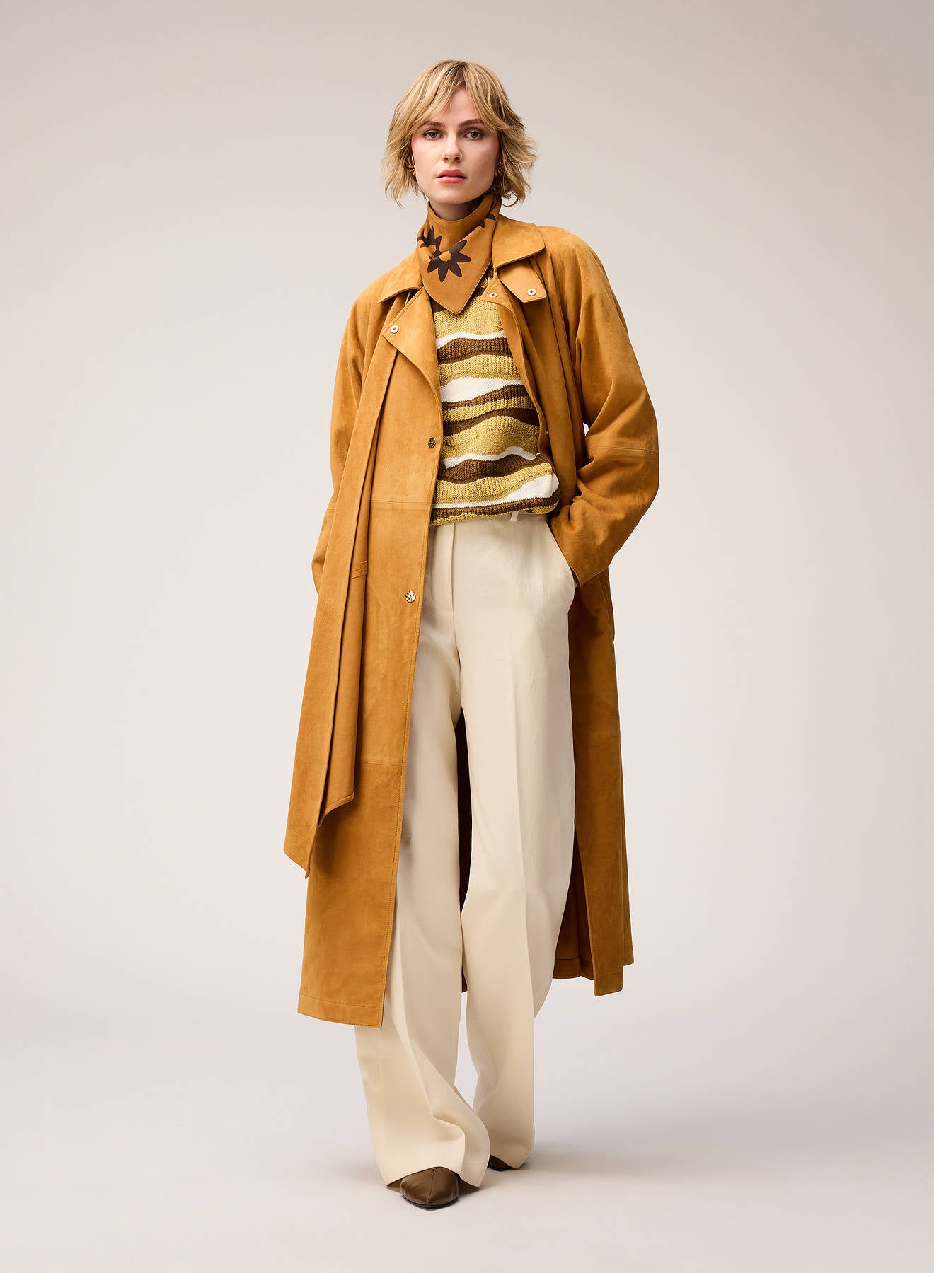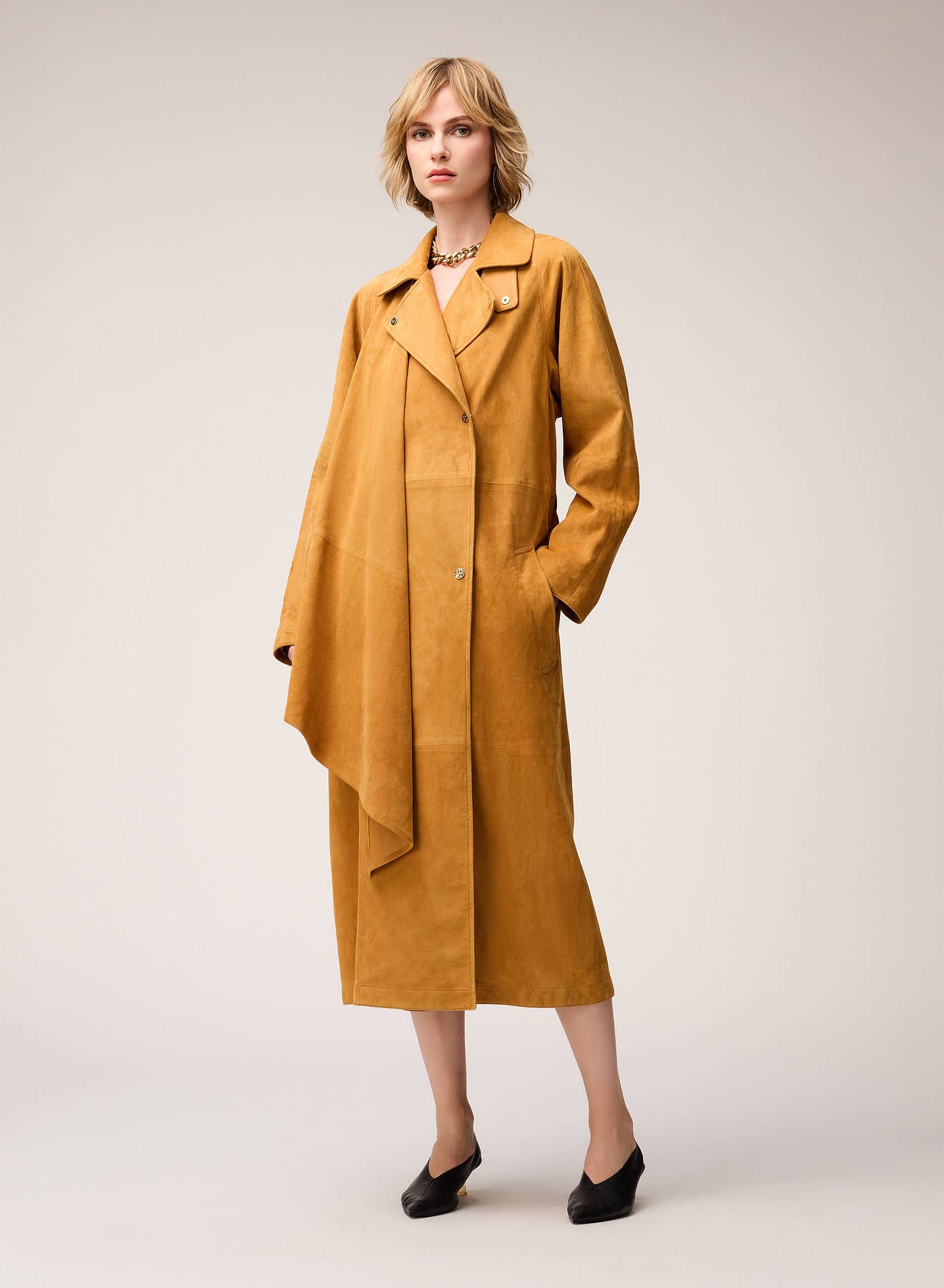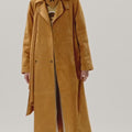 This trench coat designed with a non-detachable integrated scarf and a structured collar latch is defined by a sharp, tailored silhouette. Crafted from exquisite lamb suede with a nappa reverse side that provide a sumptuous texture further elevating the garment's refinement, it is designed for durability thanks to the unique treatment protecting the outer and inner layers. A matching suede belt cinches the waist, while the signature pocket features an intricate geometric inlay inspired by Manuela Navas, the artist whose personal story of renewal and evolution informed Retori's Chapter 03 collection. Finished with gold-plated, logo-engraved hammered snap buttons, this piece is a statement of elevated craftsmanship.