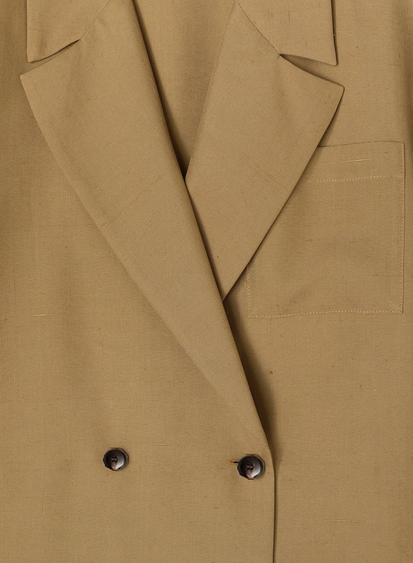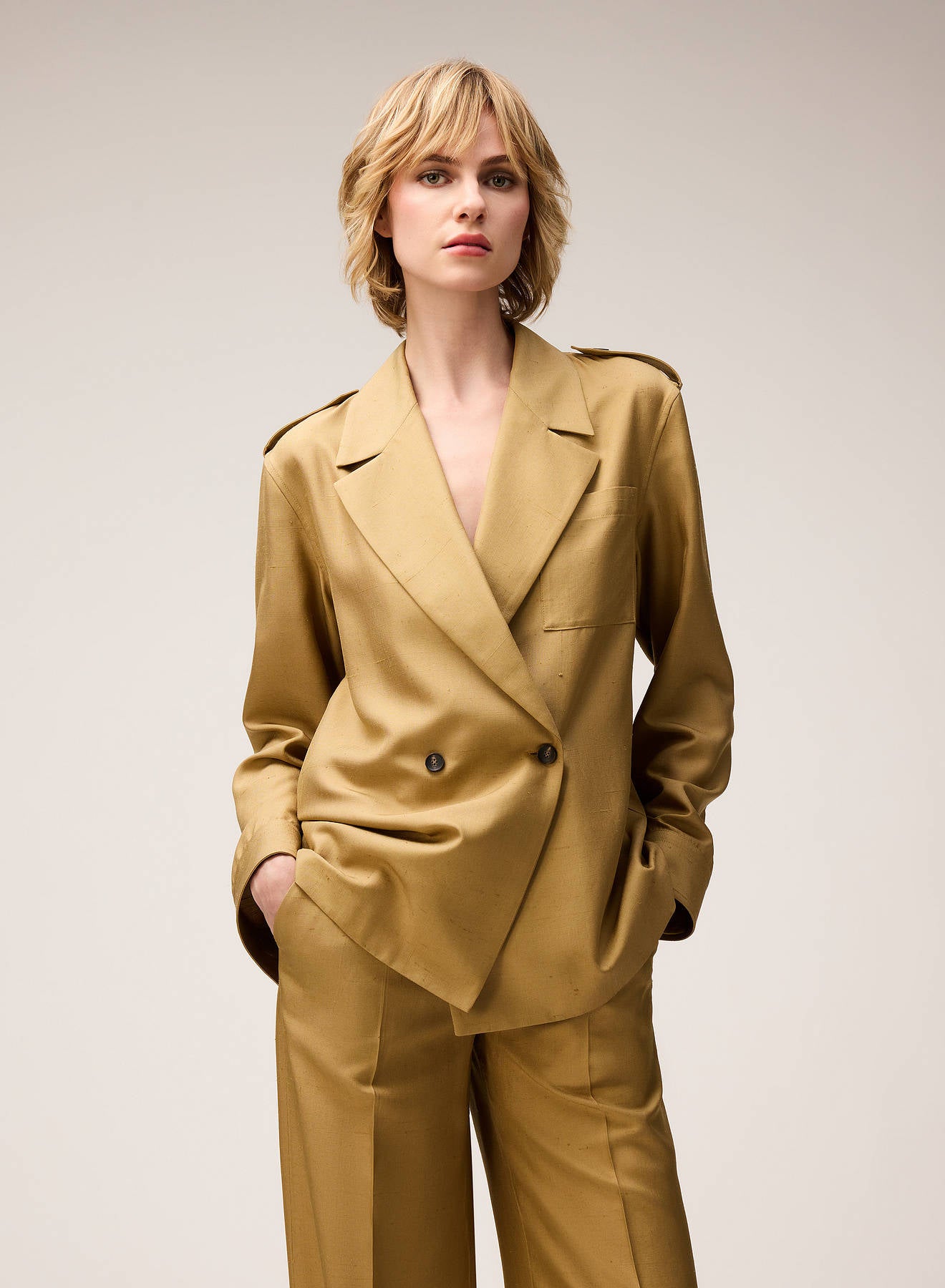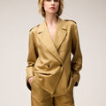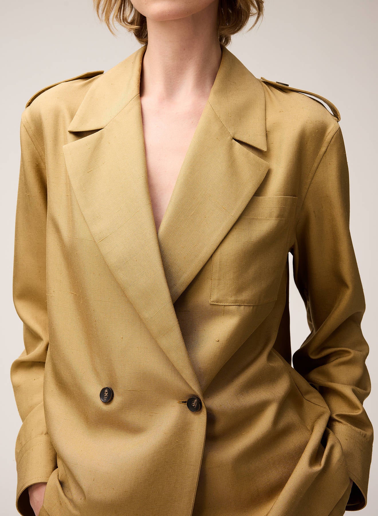 Crafted from textured shantung silk with natural, one-of-a-kind irregularities, this trenchcoat-inspired, double-breasted blazer boasts distinctive notch lapels, shoulder epaulettes with horn buttons, a left chest pocket, and minimal cuffs embellished with small horn buttons - details that elevate its sophisticated character.