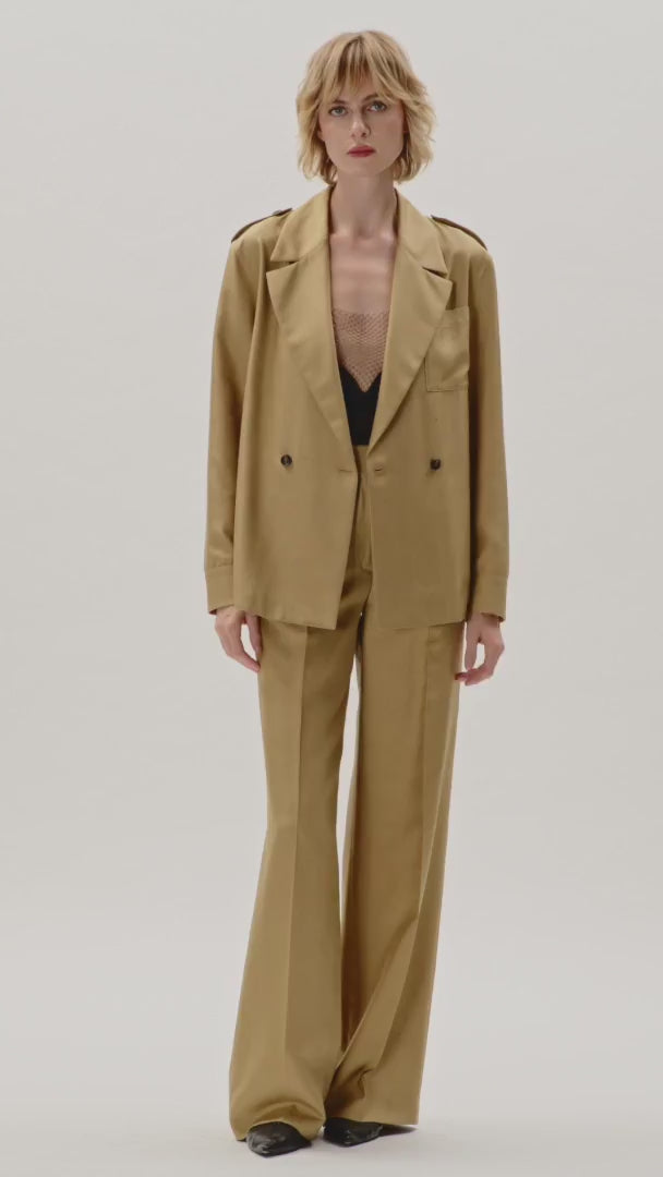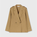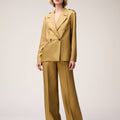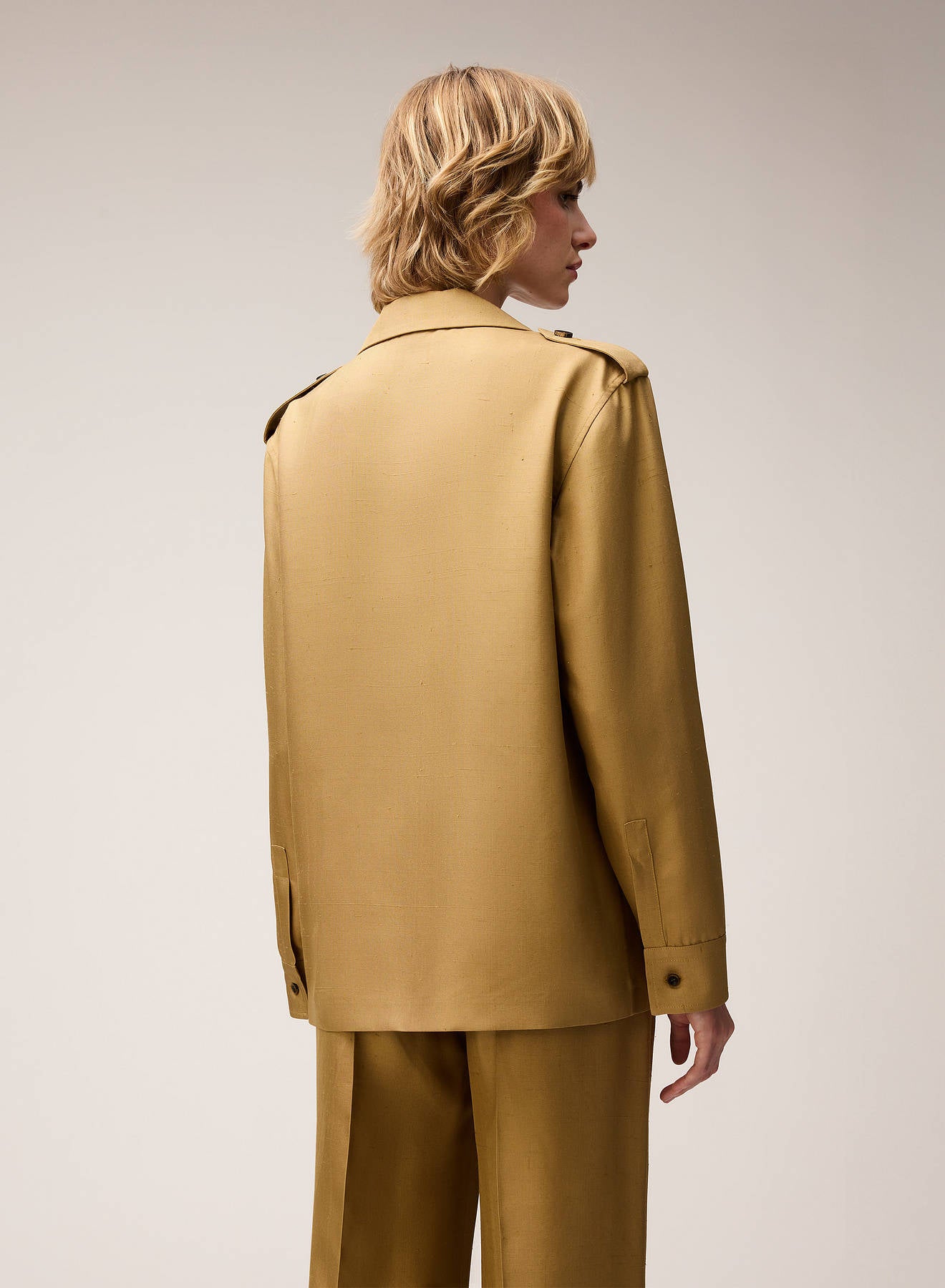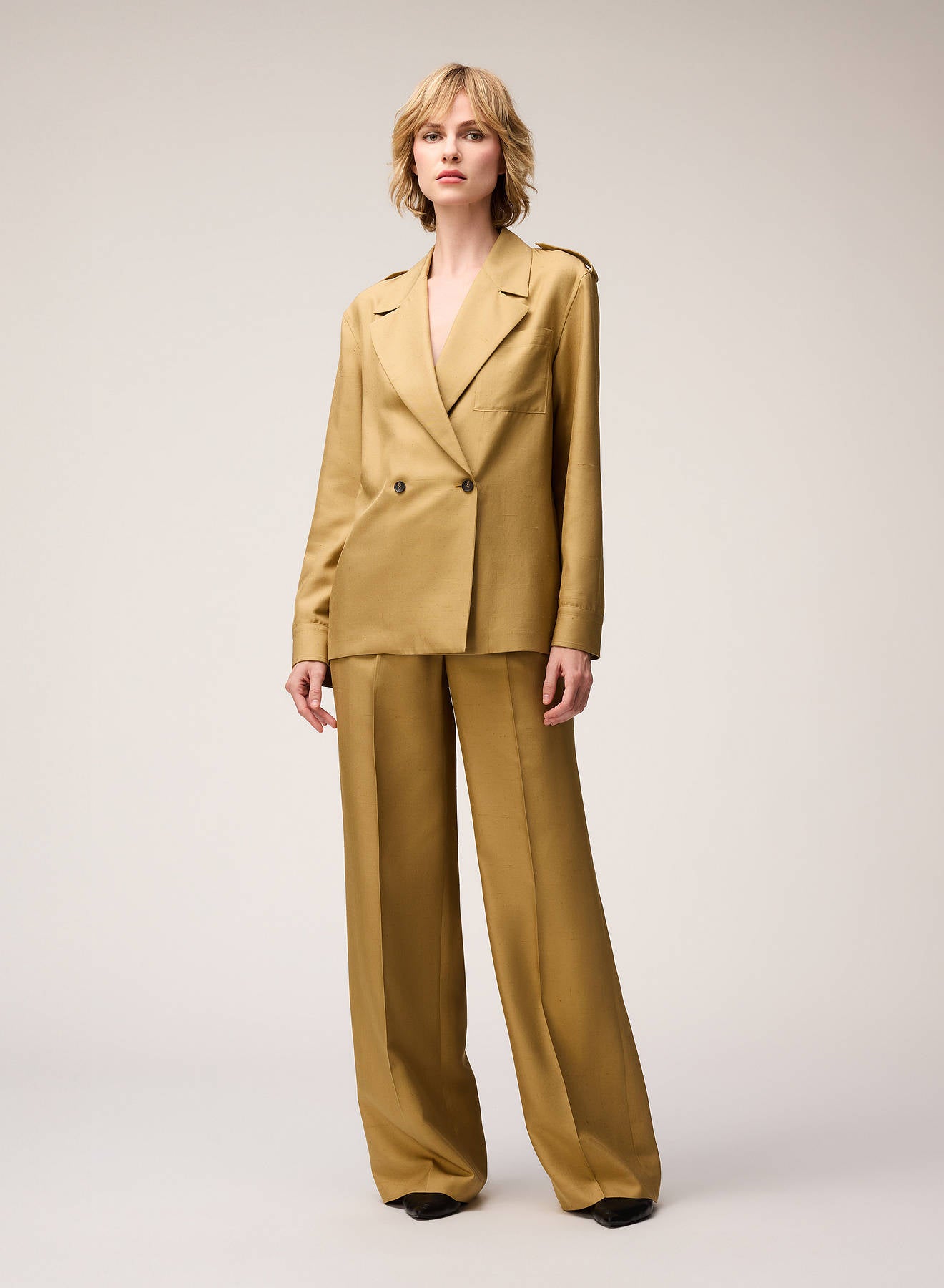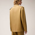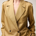 Crafted from textured shantung silk with natural, one-of-a-kind irregularities, this trenchcoat-inspired, double-breasted blazer boasts distinctive notch lapels, shoulder epaulettes with horn buttons, a left chest pocket, and minimal cuffs embellished with small horn buttons - details that elevate its sophisticated character.